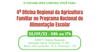 Acontecerá em Barra de São Francisco, no dia (25), de 8h às 17h na EMEFTI Ozéias Resende, bairro Vila Landinha, a 4 Oficina Regional da Agricultura Familiar no Programa Nacional de Alimentação Escolar.