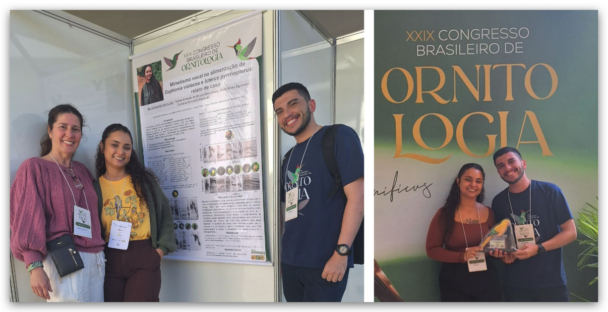 O Grupo de Ornitologia da UFES, coordenado pela Profa. Dra. Carolina Demetrio Ferreira (Departamento de Biologia/CCENS), marcou presença no XXIX Congresso Brasileiro de Ornitologia. O trabalho “Mimetismo vocal na alimentação de Euphonia violacea e Icterus pyrrhopterus: relato de caso” conquistou o prêmio Helmut Sick em 1º lugar na seção pôster.