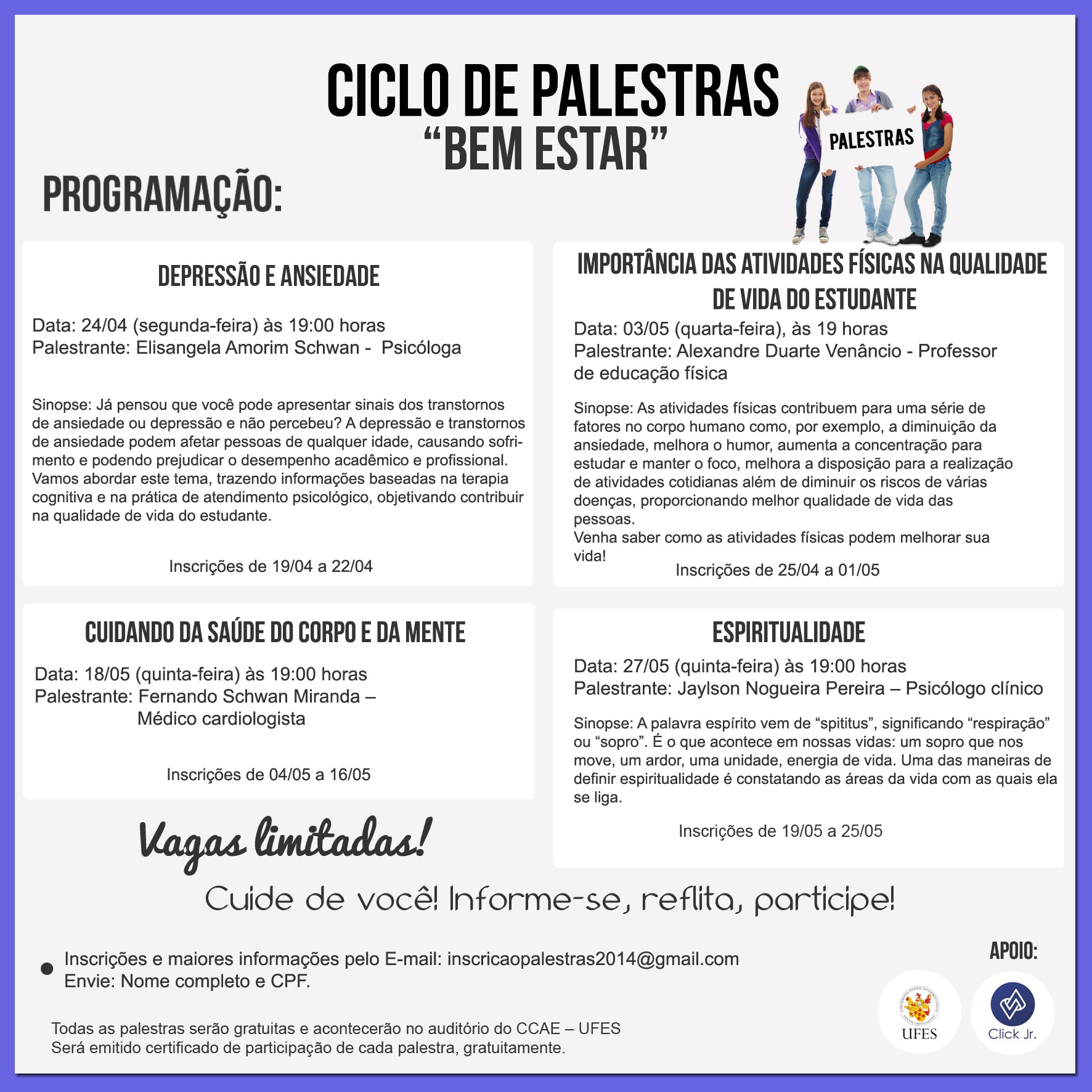 A Equipe "Preparando Estudantes para o Mercado de Trabalho" realizará um Ciclo de Palestras sobre Bem-Estar para estudantes nos dias 24/04, 03/05, 18/05 e 27/05, com os seguintes temas: