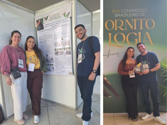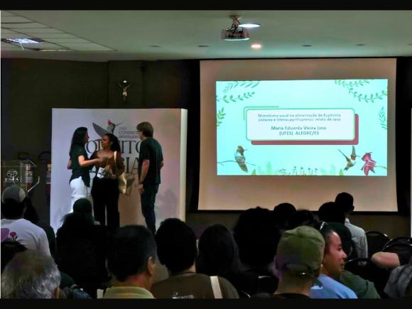 O Grupo de Ornitologia da UFES, coordenado pela Profa. Dra. Carolina Demetrio Ferreira (Departamento de Biologia/CCENS), marcou presença no XXIX Congresso Brasileiro de Ornitologia. O trabalho “Mimetismo vocal na alimentação de Euphonia violacea e Icterus pyrrhopterus: relato de caso” conquistou o prêmio Helmut Sick em 1º lugar na seção pôster.