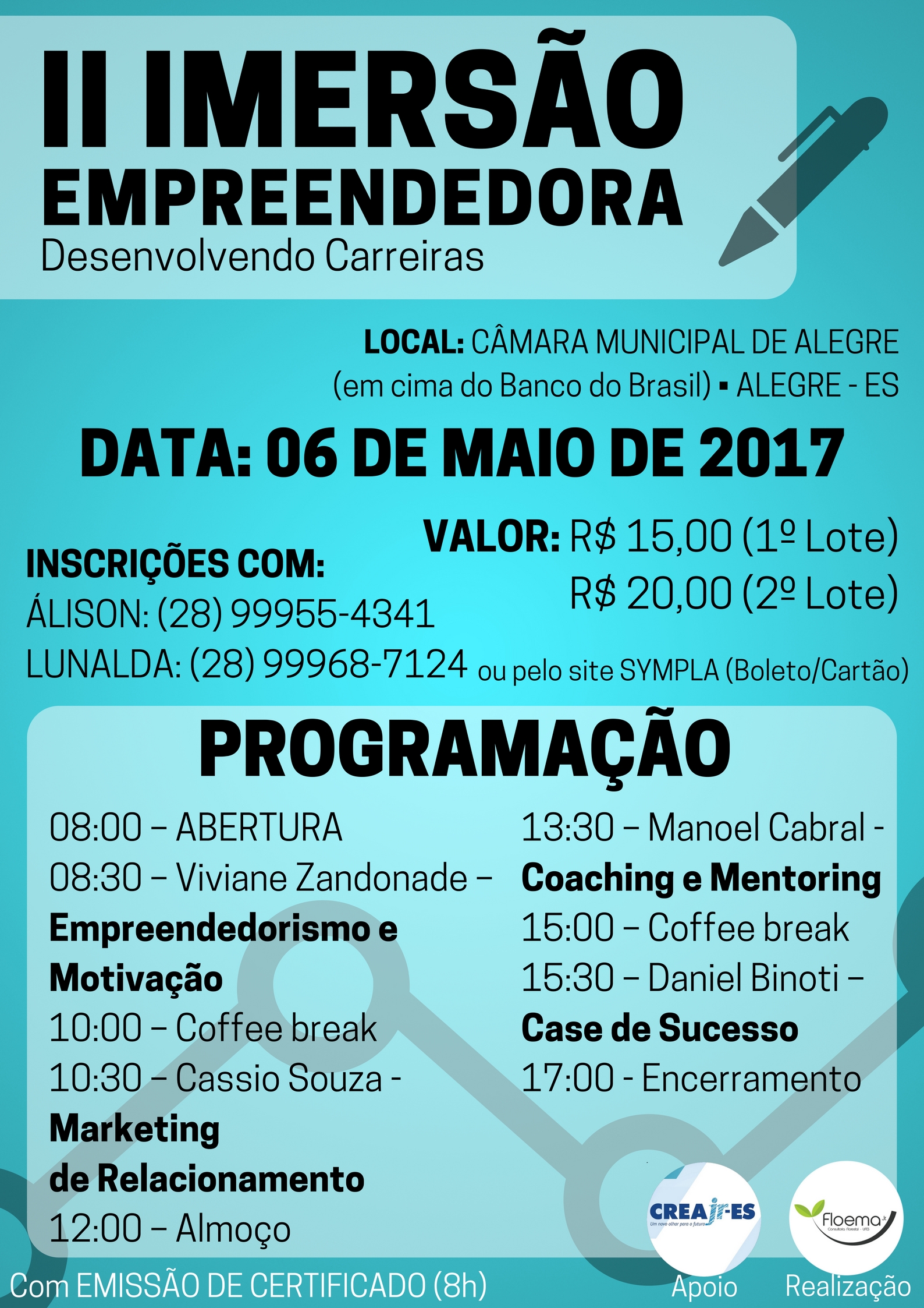 A II Imersão Empreendedora - Desenvolvendo Carreiras levará às pessoas a oportunidade de crescimento por meio de uma VISÃO GLOBAL sobre EMPREENDEDORISMO. Você terá a chance de descobrir sua alma de empreendedor ou aprimorar sua visão dinâmica! O evento será realizado na Câmara Municipal de Alegre, no dia 06 de maio, das 8 às 17h.