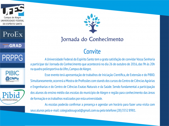 A I Jornada do Conhecimento acontecerá no dia 26 de outubro de 2016, das 9h às 20h, na Quadra Poliesportiva da Ufes - Campus de Alegre.