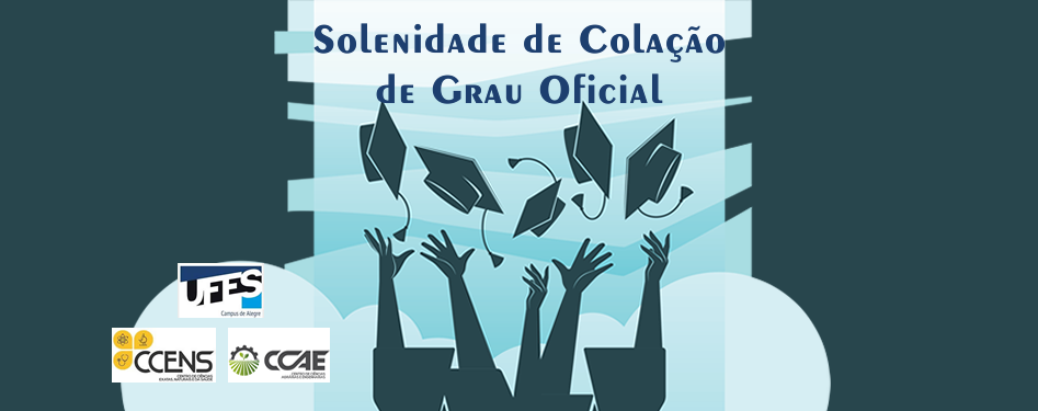 As Direções do Centro de Ciências Agrárias e Engenharias e do Centro de Ciências Exatas, Naturais e da Saúde da Universidade Federal do Espírito Santo e os Formandos 2018/1 convidam a todos para a Solenidade Oficial de Colação de Grau, que será realizada às 18 horas do dia 17 de agosto de 2018, no Auditório do IFES de Alegre, em Rive.